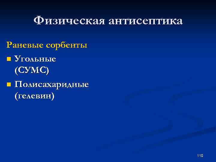 Физическая антисептика Раневые сорбенты n Угольные (СУМС) n Полисахаридные (гелевин) 110