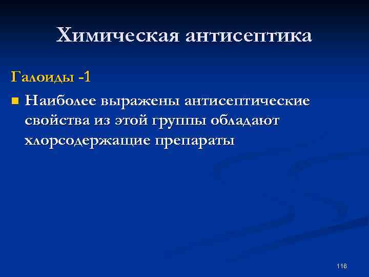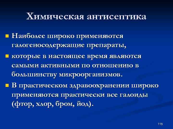 Химическая антисептика Наиболее широко применяются галогеносодержащие препараты, n которые в настоящее время являются самыми активными по отношению в большинству микроорганизмов. n В практическом здравоохранении широко применяются практически все галоиды (фтор, хлор, бром, йод). n 115