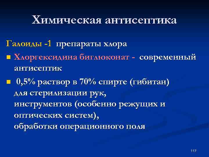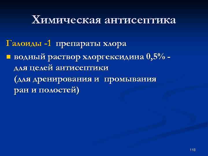 Химическая антисептика Галоиды -1 препараты хлора n Хлоргексидина биглюконат - современный антисептик n 0, 5% раствор в 70% спирте (гибитан) для стерилизации рук, инструментов (особенно режущих и оптических систем), обработки операционного поля 117