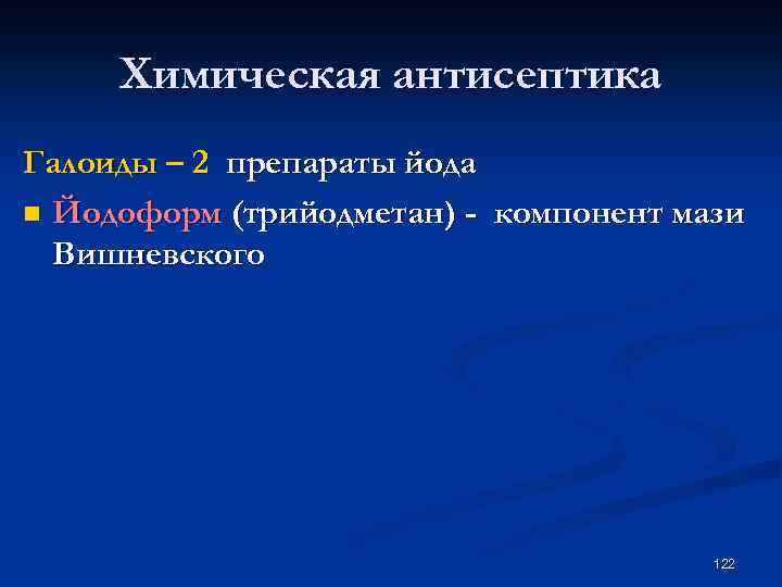 Химическая антисептика Галоиды – 2 препараты йода n Йодоформ (трийодметан) - компонент мази Вишневского 122