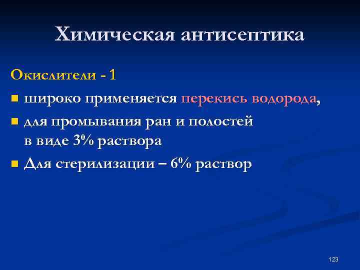 Химическая антисептика Окислители - 1 n широко применяется перекись водорода, n для промывания ран и полостей в виде 3% раствора n Для стерилизации – 6% раствор 123