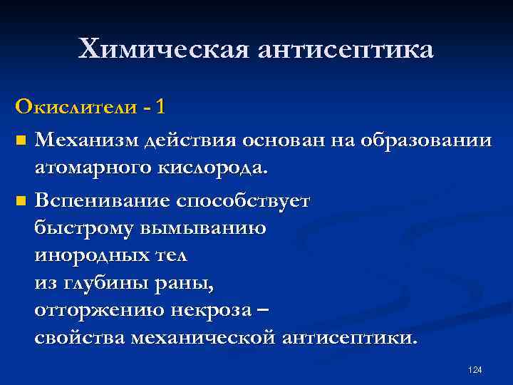 Химическая антисептика Окислители - 1 n Механизм действия основан на образовании атомарного кислорода. n Вспенивание способствует быстрому вымыванию инородных тел из глубины раны, отторжению некроза – свойства механической антисептики. 124