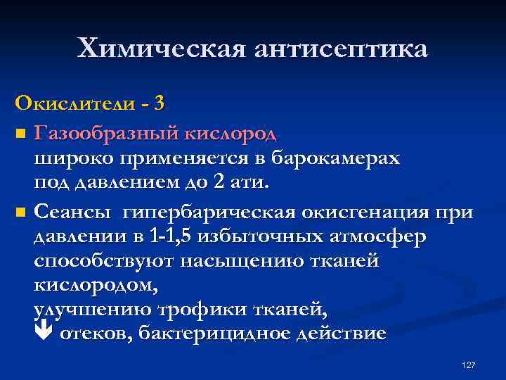 Химическая антисептика Окислители - 3 n Газообразный кислород широко применяется в барокамерах под давлением до 2 ати. n Сеансы гипербарическая окисгенация при давлении в 1 -1, 5 избыточных атмосфер способствуют насыщению тканей кислородом, улучшению трофики тканей, отеков, бактерицидное действие 127