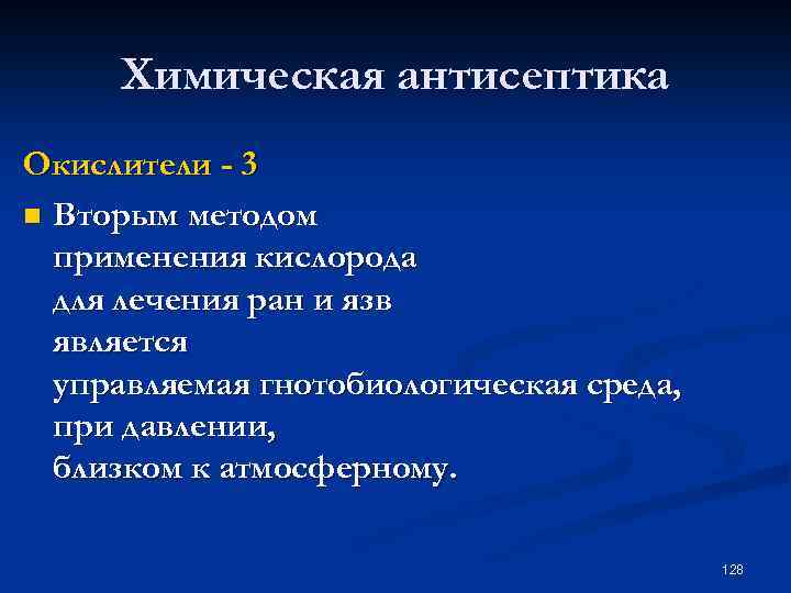 Химическая антисептика Окислители - 3 n Вторым методом применения кислорода для лечения ран и язв является управляемая гнотобиологическая среда, при давлении, близком к атмосферному. 128