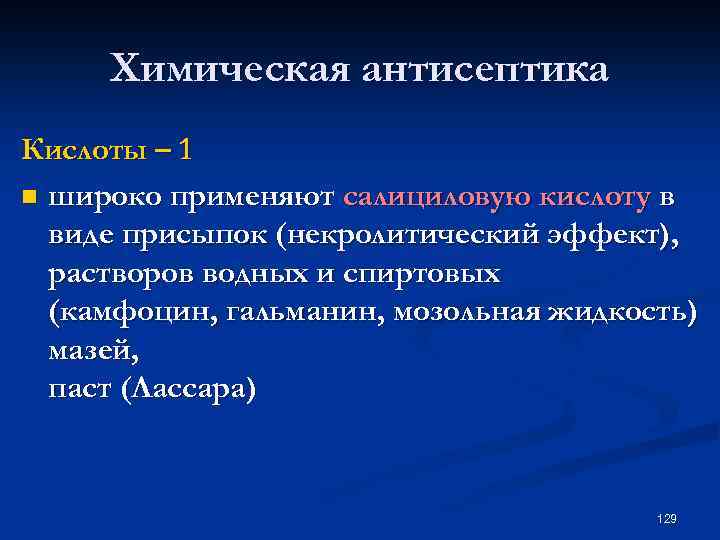 Химическая антисептика Кислоты – 1 n широко применяют салициловую кислоту в виде присыпок (некролитический эффект), растворов водных и спиртовых (камфоцин, гальманин, мозольная жидкость) мазей, паст (Лассара) 129
