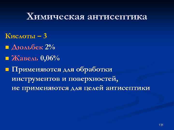 Химическая антисептика Кислоты – 3 n Дюльбек 2% n Жавель 0, 06% n Применяются для обработки инструментов и поверхностей, не применяются для целей антисептики 131
