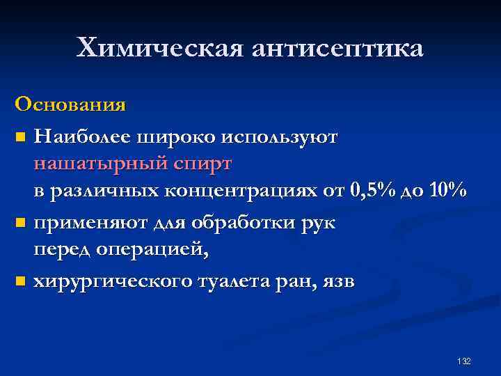 Химическая антисептика Основания n Наиболее широко используют нашатырный спирт в различных концентрациях от 0, 5% до 10% n применяют для обработки рук перед операцией, n хирургического туалета ран, язв 132