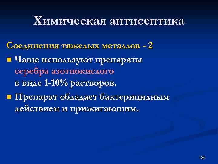 Химическая антисептика Соединения тяжелых металлов - 2 n Чаще используют препараты серебра азотнокислого в виде 1 -10% растворов. n Препарат обладает бактерицидным действием и прижигающим. 134