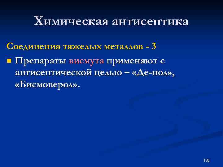Химическая антисептика Соединения тяжелых металлов - 3 n Препараты висмута применяют с антисептической целью – «Де-нол» , «Бисмоверол» . 136