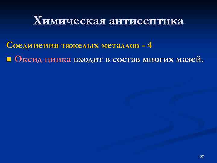 Химическая антисептика Соединения тяжелых металлов - 4 n Оксид цинка входит в состав многих мазей. 137