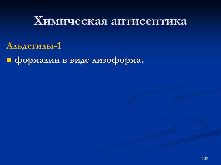 Химическая антисептика Альдегиды-1 n формалин в виде лизоформа. 139