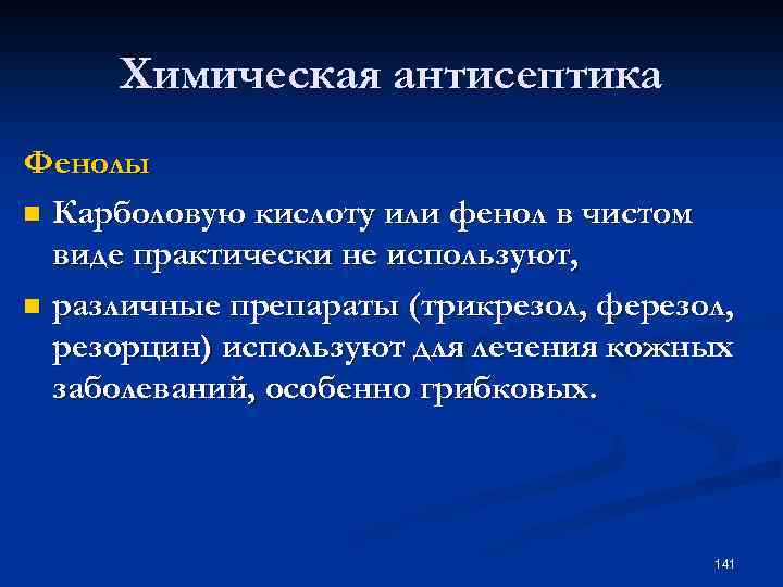 Химическая антисептика Фенолы n Карболовую кислоту или фенол в чистом виде практически не используют, n различные препараты (трикрезол, ферезол, резорцин) используют для лечения кожных заболеваний, особенно грибковых. 141