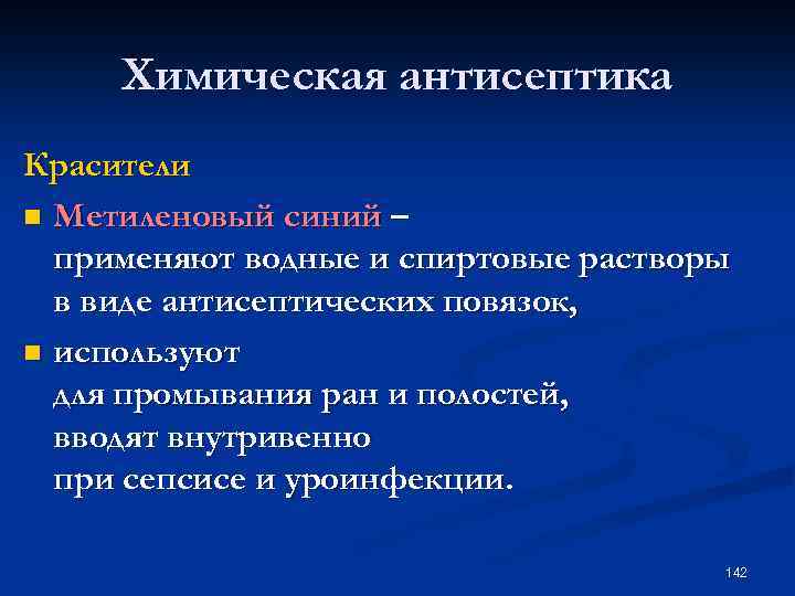 Химическая антисептика Красители n Метиленовый синий – применяют водные и спиртовые растворы в виде антисептических повязок, n используют для промывания ран и полостей, вводят внутривенно при сепсисе и уроинфекции. 142