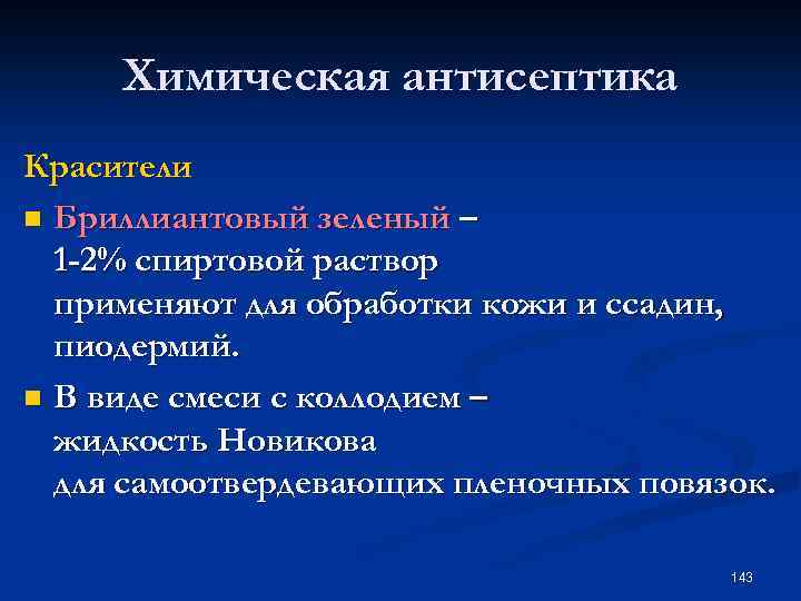 Химическая антисептика Красители n Бриллиантовый зеленый – 1 -2% спиртовой раствор применяют для обработки кожи и ссадин, пиодермий. n В виде смеси с коллодием – жидкость Новикова для самоотвердевающих пленочных повязок. 143
