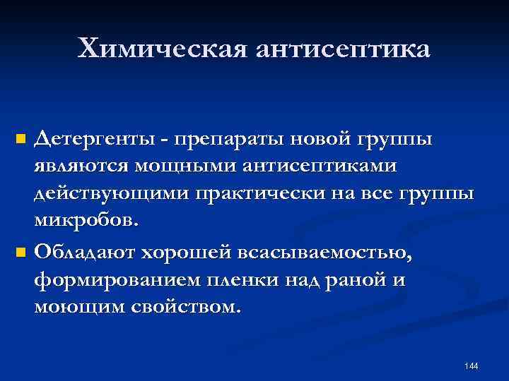 Химическая антисептика Детергенты - препараты новой группы являются мощными антисептиками действующими практически на все группы микробов. n Обладают хорошей всасываемостью, формированием пленки над раной и моющим свойством. n 144