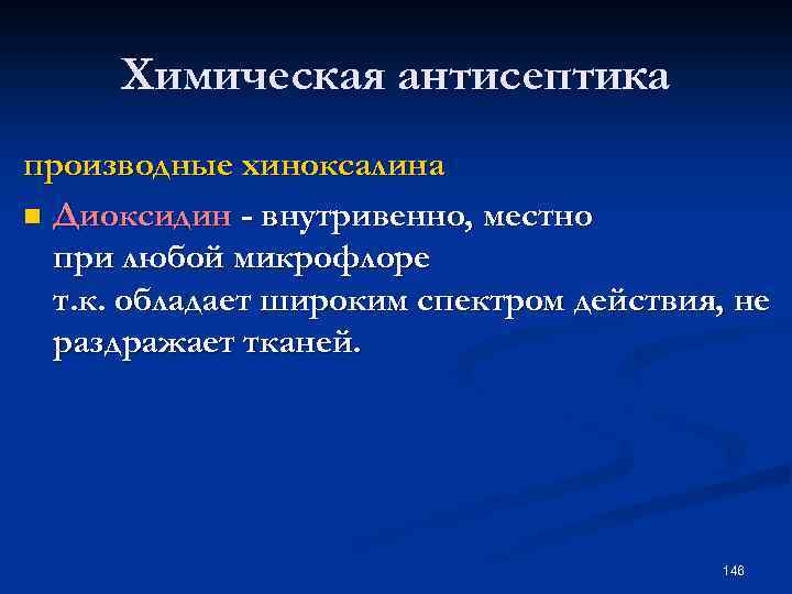 Химическая антисептика производные хиноксалина n Диоксидин - внутривенно, местно при любой микрофлоре т. к. обладает широким спектром действия, не раздражает тканей. 146