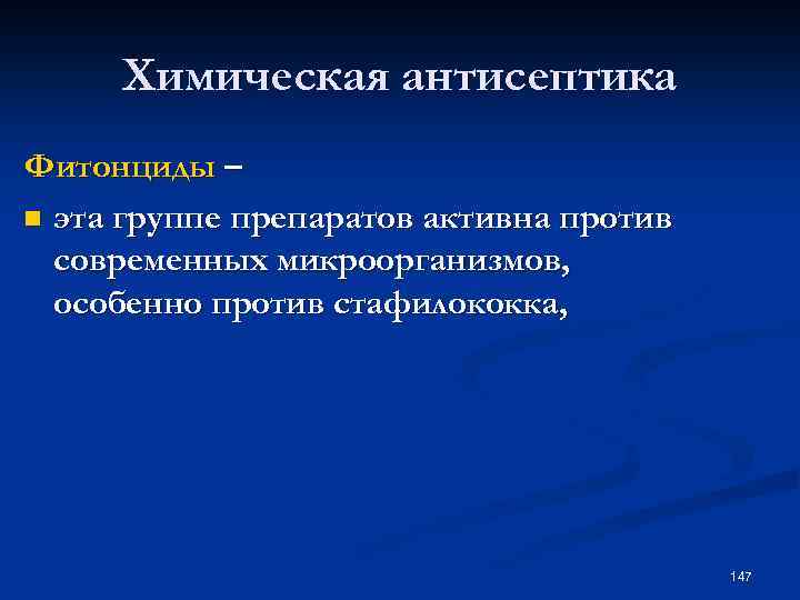 Химическая антисептика Фитонциды – n эта группе препаратов активна против современных микроорганизмов, особенно против стафилококка, 147
