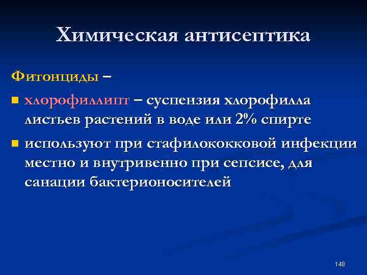Химическая антисептика Фитонциды – n хлорофиллипт – суспензия хлорофилла листьев растений в воде или 2% спирте n используют при стафилококковой инфекции местно и внутривенно при сепсисе, для санации бактерионосителей 148