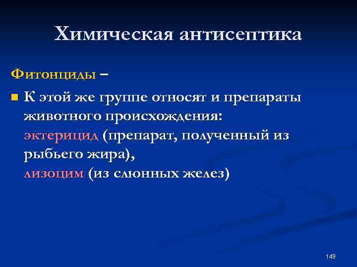 Химическая антисептика Фитонциды – n К этой же группе относят и препараты животного происхождения: эктерицид (препарат, полученный из рыбьего жира), лизоцим (из слюнных желез) 149