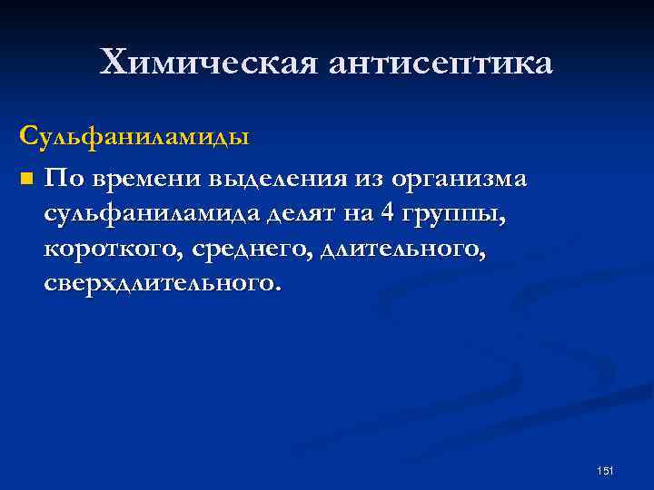 Химическая антисептика Сульфаниламиды n По времени выделения из организма сульфаниламида делят на 4 группы, короткого, среднего, длительного, сверхдлительного. 151