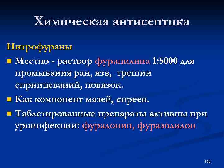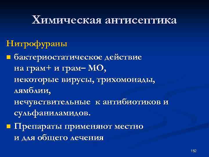Химическая антисептика Нитрофураны n бактериостатическое действие на грам+ и грам– МО, некоторые вирусы, трихомонады, лямблии, нечувствительные к антибиотиков и сульфаниламидов. n Препараты применяют местно и для общего лечения 152