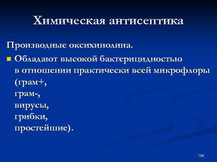 Химическая антисептика Производные оксихинолина. n Обладают высокой бактерицидностью в отношении практически всей микрофлоры (грам+, грам-, вирусы, грибки, простейшие). 154