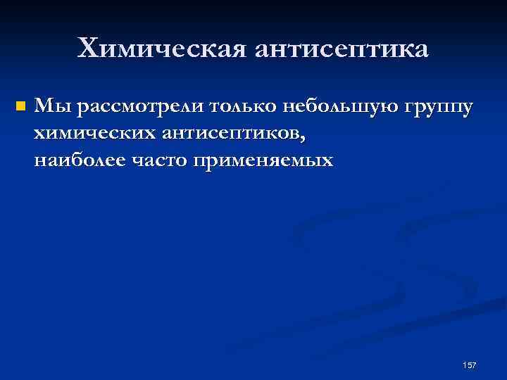 Химическая антисептика n Мы рассмотрели только небольшую группу химических антисептиков, наиболее часто применяемых 157
