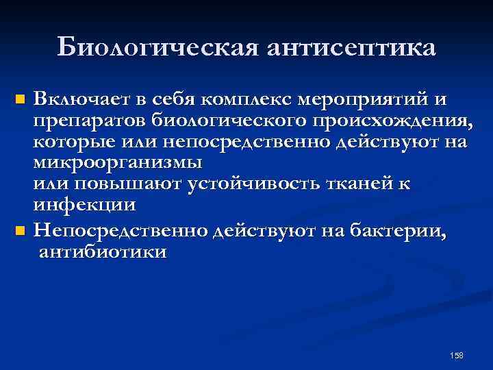 Биологическая антисептика Включает в себя комплекс мероприятий и препаратов биологического происхождения, которые или непосредственно действуют на микроорганизмы или повышают устойчивость тканей к инфекции n Непосредственно действуют на бактерии, антибиотики n 158