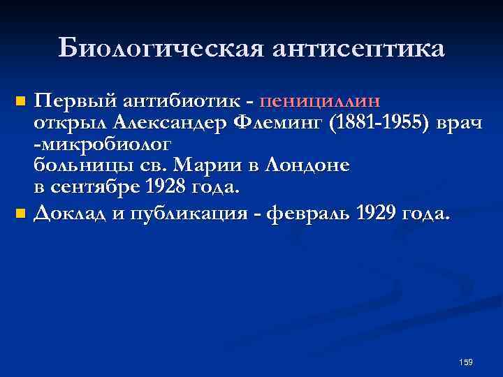Биологическая антисептика Первый антибиотик - пенициллин открыл Александер Флеминг (1881 -1955) врач -микробиолог больницы св. Марии в Лондоне в сентябре 1928 года. n Доклад и публикация - февраль 1929 года. n 159