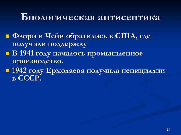 Биологическая антисептика Флори и Чейн обратились в США, где получили поддержку n В 1941 году началось промышленное производство. n 1942 году Ермолаева получила пенициллин в СССР. n 161