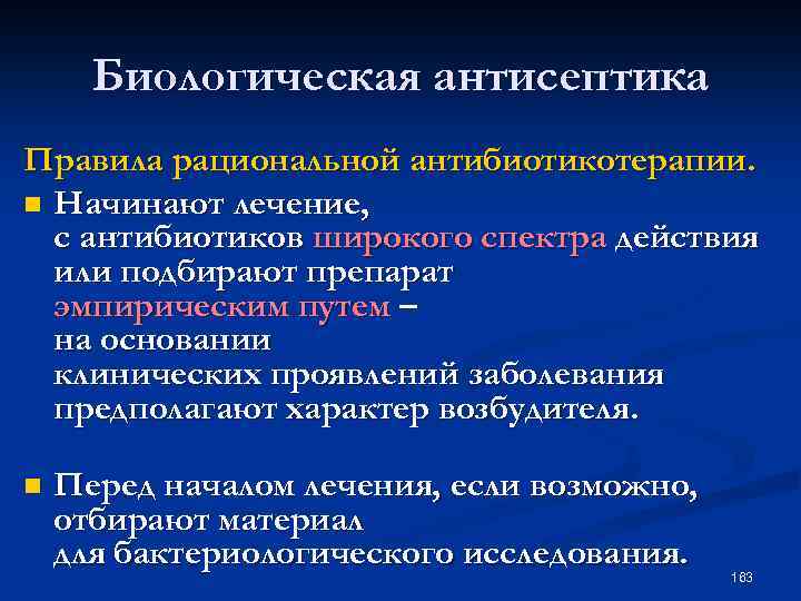 Биологическая антисептика Правила рациональной антибиотикотерапии. n Начинают лечение, с антибиотиков широкого спектра действия или подбирают препарат эмпирическим путем – на основании клинических проявлений заболевания предполагают характер возбудителя. n Перед началом лечения, если возможно, отбирают материал для бактериологического исследования. 163