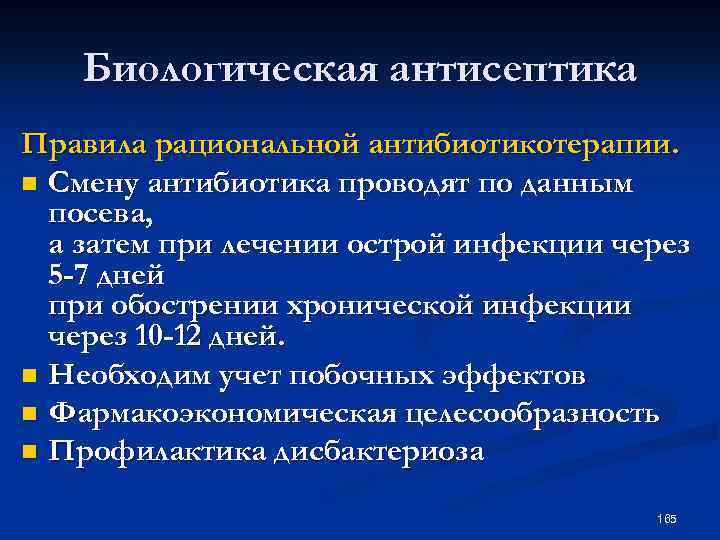 Биологическая антисептика Правила рациональной антибиотикотерапии. n Смену антибиотика проводят по данным посева, а затем при лечении острой инфекции через 5 -7 дней при обострении хронической инфекции через 10 -12 дней. n Необходим учет побочных эффектов n Фармакоэкономическая целесообразность n Профилактика дисбактериоза 165