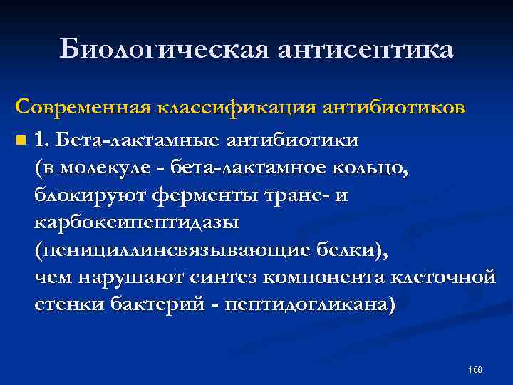 Биологическая антисептика Современная классификация антибиотиков n 1. Бета-лактамные антибиотики (в молекуле - бета-лактамное кольцо, блокируют ферменты транс- и карбоксипептидазы (пенициллинсвязывающие белки), чем нарушают синтез компонента клеточной стенки бактерий - пептидогликана) 166