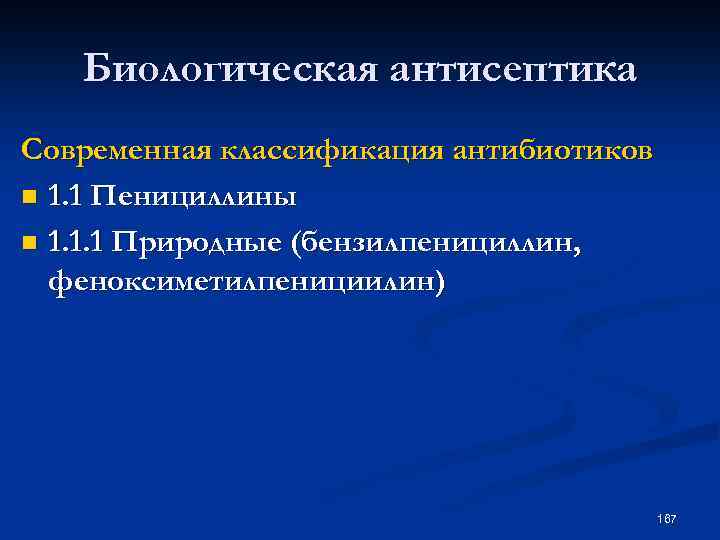 Биологическая антисептика Современная классификация антибиотиков n 1. 1 Пенициллины n 1. 1. 1 Природные (бензилпенициллин, феноксиметилпенициилин) 167