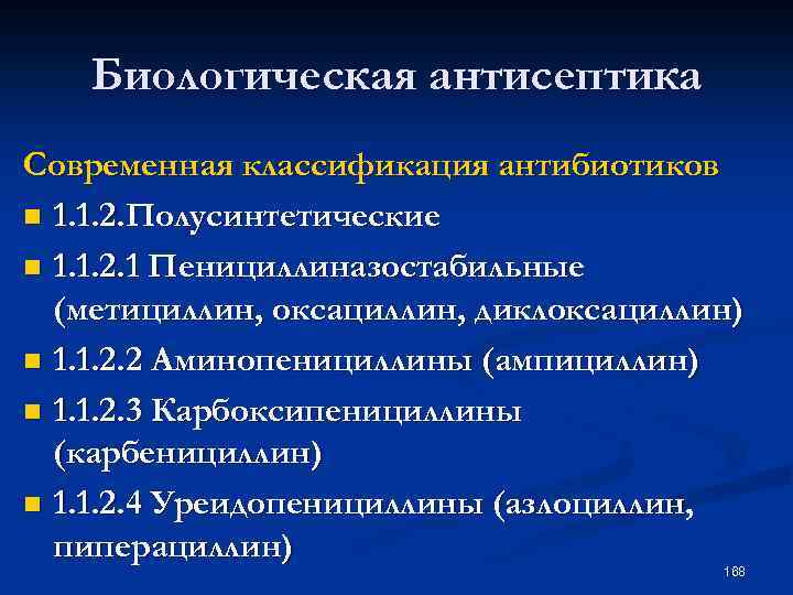 Биологическая антисептика Современная классификация антибиотиков n 1. 1. 2. Полусинтетические n 1. 1. 2. 1 Пенициллиназостабильные (метициллин, оксациллин, диклоксациллин) n 1. 1. 2. 2 Аминопенициллины (ампициллин) n 1. 1. 2. 3 Карбоксипенициллины (карбенициллин) n 1. 1. 2. 4 Уреидопенициллины (азлоциллин, пиперациллин) 168