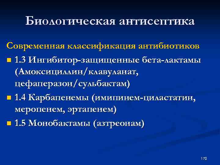 Биологическая антисептика Современная классификация антибиотиков n 1. 3 Ингибитор-защищенные бета-лактамы (Амоксициллин/клавуланат, цефаперазон/сульбактам) n 1. 4 Карбапенемы (имипинем-циластатин, меропенем, эртапенем) n 1. 5 Монобактамы (азтреонам) 170