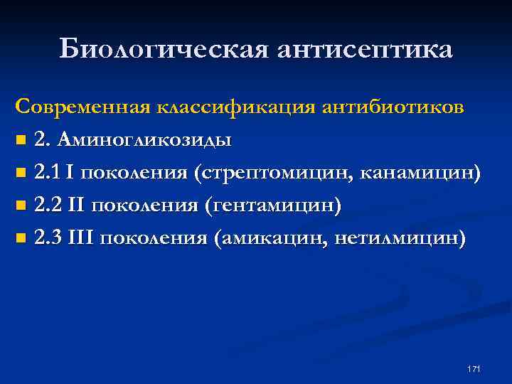 Биологическая антисептика Современная классификация антибиотиков n 2. Аминогликозиды n 2. 1 I поколения (стрептомицин, канамицин) n 2. 2 II поколения (гентамицин) n 2. 3 III поколения (амикацин, нетилмицин) 171