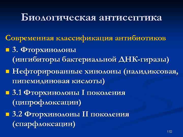 Биологическая антисептика Современная классификация антибиотиков n 3. Фторхинолоны (ингибиторы бактериальной ДНК-гиразы) n Нефторированные хинолоны (налидиксовая, пипемидиновая кислоты) n 3. 1 Фторхинолоны I поколения (ципрофлоксацин) n 3. 2 Фторхинолоны II поколения (спарфлоксацин) 172
