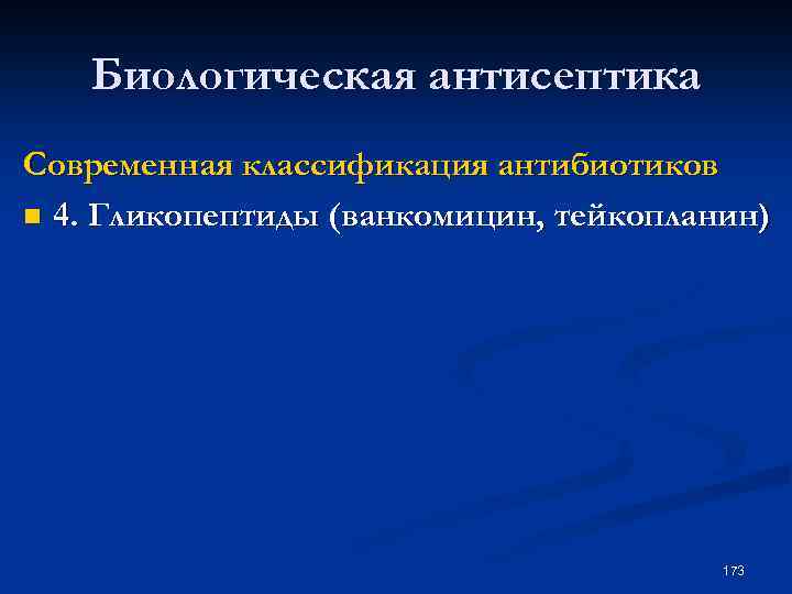 Биологическая антисептика Современная классификация антибиотиков n 4. Гликопептиды (ванкомицин, тейкопланин) 173