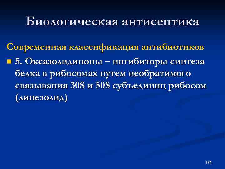 Биологическая антисептика Современная классификация антибиотиков n 5. Оксазолидиноны – ингибиторы синтеза белка в рибосомах путем необратимого связывания 30 S и 50 S субъединиц рибосом (линезолид) 174