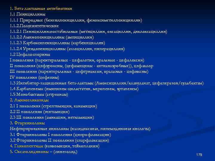 1. Бета-лактамные антибиотики 1. 1 Пенициллины 1. 1. 1 Природные (бензилпенициллин, феноксиметилпенициилин) 1. 1. 2. Полусинтетические 1. 1. 2. 1 Пенициллиназостабильные (метициллин, оксациллин, диклоксациллин) 1. 1. 2. 2 Аминопенициллины (ампициллин) 1. 1. 2. 3 Карбоксипенициллины (карбенициллин) 1. 1. 2. 4 Уреидопенициллины (азлоциллин, пиперациллин) 1. 2 Цефалоспорины I поколения (парентеральные - цефалотин, оральные - цефалексин) II поколения (цефуроксим, (цефамицины - антианаэробные)), цефаклор III поколения (парентеральные - цефтриаксон, оральные - цефиксим) IV поколения (цефепим) 1. 3 Ингибитор-защищенные бета-лактамы (Амоксициллин/клавуланат, цефаперазон/сульбактам) 1. 4 Карбапенемы (имипинем-циластатин, меропенем, эртапенем) 1. 5 Монобактамы (азтреонам) 2. Аминогликозиды 2. 1 I поколения (стрептомицин, канамицин) 2. 2 II поколения (гентамицин) 2. 3 III поколения (амикацин, нетилмицин) 3. Фторхинолоны Нефторированные хинолоны (налидиксовая, пипемидиновая кислоты) 3. 1 Фторхинолоны I поколения (ципрофлоксацин) 3. 2 Фторхинолоны II поколения (спарфлоксацин) 4. Гликопептиды (ванкомицин, тейкопланин) 5. Оксазолидиноны – (линезолид) 175