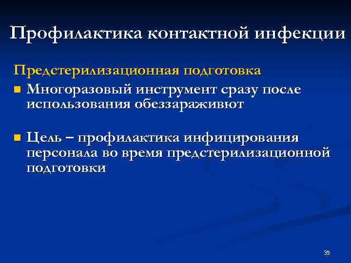 Профилактика контактной инфекции Предстерилизационная подготовка n Многоразовый инструмент сразу после использования обеззараживют n Цель – профилактика инфицирования персонала во время предстерилизационной подготовки 35