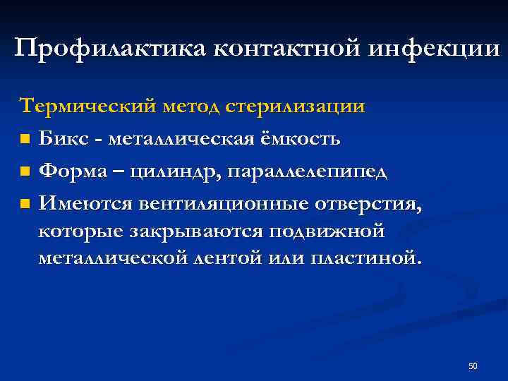 Профилактика контактной инфекции Термический метод стерилизации n Бикс - металлическая ёмкость n Форма – цилиндр, параллелепипед n Имеются вентиляционные отверстия, которые закрываются подвижной металлической лентой или пластиной. 50