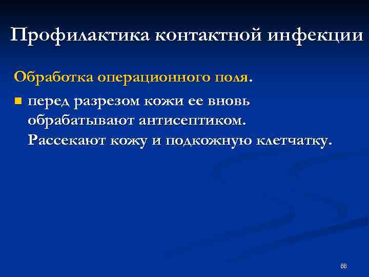 Профилактика контактной инфекции Обработка операционного поля. n перед разрезом кожи ее вновь обрабатывают антисептиком. Рассекают кожу и подкожную клетчатку. 66