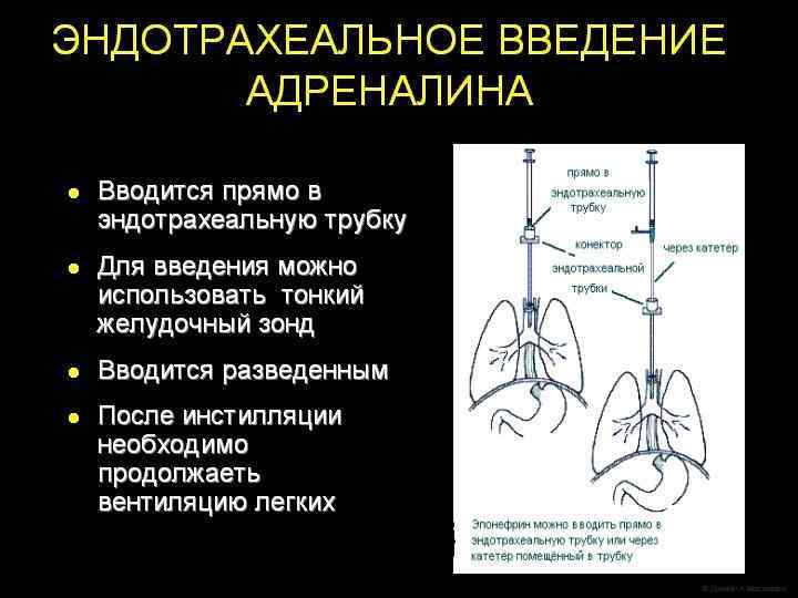 При оценке: ЧСС - 1 (2) балла, дыхание - 0 баллов, цвет кожи - 0 -необходимы интубация трахеи, санация ТБД, ИВЛ. При ЧСС менее 60 -80 в 1 минуту - закрытый массаж сердца, при отсутствии эффекта в течение 10 -15 сек - эндотрахеальное введение Sol. Adrenalini 0, 01% (десятикратное разведение ампульного Sol. Adrenalini 0, 1% в Sol. Natrii chloridi 0, 9%) 0, 1 -0, 3 мл/кг В особенно тяжелых случаях (рождение ребенка в состоянии клинической смерти) к проведению реанимационных мероприятий, включающих интубацию трахеи, санацию ВДП, эндотрахеальное введение адреналина, закрытый массаж сердца, ИВЛ, следует приступить немедленно после извлечения ребенка. При проведении реанимации необходим постоянный контроль ее эффективности. дыхания. Отсутствие эффекта будет требовать продолжения ИВЛ, срочной катетеризации пупочной вены