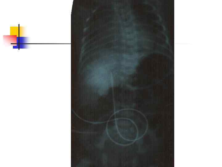 Осложнения катетеризации пупочной вены 1) Ошибочное введение катетера - артерия, урахус, паравенозное пространство. 2) Нарушение асептики и техники – перфорация стенки вены, травма печени, эмболия, сепсис. . 3) Неправильное положение катетера а) в портальном кровотоке: портальная гипертензия; ишемия кишечника, некроз клеток печени язвеннонекротический энтероколит, желудочно-кишечное кровотечение; б) уровень диафрагмы: усиление СДР, релаксация диафрагмы; в) в сердце: остановка сердца, инфаркт миокарда, нарушения ритма.