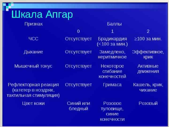 Классификация асфиксии новорожденного. Согласно Международной классификации болезней (МКБ) IX пересмотра (Женева, 1980), в зависимости от тяжести состояния ребенка при рождении, выделяют: 1. Асфиксию средней тяжести (умеренная) - 4 -6 баллов на первой минуте, к пятой - 8 -10 баллов 2. Тяжелую асфиксию- 0 -3 балла по шкале Апгар на 1 -й минуте, к 5 -й - менее 7 баллов