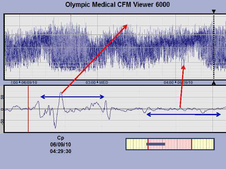 Амплитудно-интегрированная электроэнцефалография • Определение тяжести повреждения мозга в первые 24 часа после рождения • Начальные изменения – подавление частоты и амплитуды а-ЭЭГ • Динамика а-ЭЭГ чрезвычайно важна после назначения п/судорожной терапии, т. к. может отмечаться разница между клиническими проявлениями и электрофизиологической активностью мозга