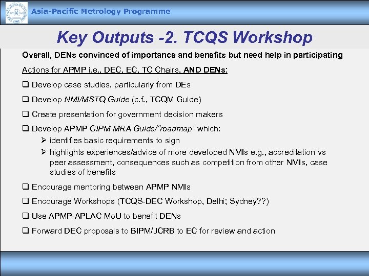 Asia-Pacific Metrology Programme Key Outputs -2. TCQS Workshop Overall, DENs convinced of importance and benefits but need help in participating Actions for APMP i. e. , DEC, TC Chairs, AND DENs: q Develop case studies, particularly from DEs q Develop NMI/MSTQ Guide (c. f. , TCQM Guide) q Create presentation for government decision makers q Develop APMP CIPM MRA Guide/“roadmap” which: Ø identifies basic requirements to sign Ø highlights experiences/advice of more developed NMIs e. g. , accreditation vs peer assessment, consequences such as competition from other NMIs, case studies of benefits q Encourage mentoring between APMP NMIs q Encourage Workshops (TCQS-DEC Workshop, Delhi; Sydney? ? ) q Use APMP-APLAC Mo. U to benefit DENs q Forward DEC proposals to BIPM/JCRB to EC for review and action