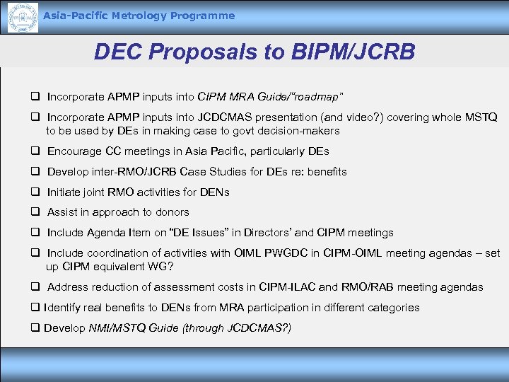 Asia-Pacific Metrology Programme DEC Proposals to BIPM/JCRB q Incorporate APMP inputs into CIPM MRA Guide/“roadmap” q Incorporate APMP inputs into JCDCMAS presentation (and video? ) covering whole MSTQ to be used by DEs in making case to govt decision-makers q Encourage CC meetings in Asia Pacific, particularly DEs q Develop inter-RMO/JCRB Case Studies for DEs re: benefits q Initiate joint RMO activities for DENs q Assist in approach to donors q Include Agenda Item on “DE Issues” in Directors’ and CIPM meetings q Include coordination of activities with OIML PWGDC in CIPM-OIML meeting agendas – set up CIPM equivalent WG? q Address reduction of assessment costs in CIPM-ILAC and RMO/RAB meeting agendas q Identify real benefits to DENs from MRA participation in different categories q Develop NMI/MSTQ Guide (through JCDCMAS? )